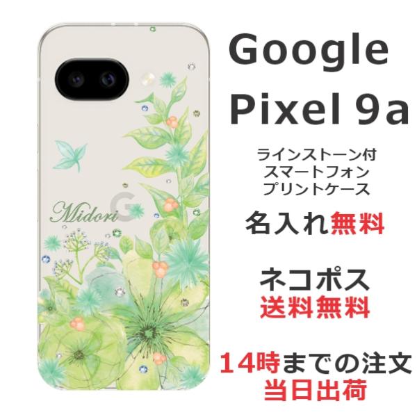 Google Pixel9a グーグルピクセル9a らふら 名入れ スマホケース ラインストーン スマホカバー 押し花風 ボタニカル グリーン