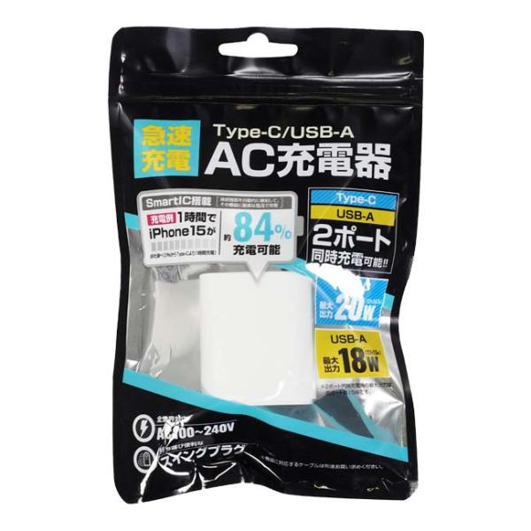 - 急速充電できるType-C・USB-Aの2ポート同時充電可能なAC充電器!スマホ・タブレット・ゲーム機など様々なデバイスにお使いいただけます。持ち運びに便利なスイングプラグと全世界対応のAC100~240V対応で、ご自宅だけでなく旅行や様々な場所で活躍!SmartIC搭載なので接続機器を自動的に検知して、その機器に最適な電流で充電してくれます。※充電例(自社調べ):iPhone15を0%からType-Cで1時間充電した場合、約84%充電可能●ブランド:株式会社ハック●商品名:AC充電器 Type-C/USB-A 急速充電●品番:HAC4249A●セット内容:本体×1(ケーブルは付属していません。ご注意ください。)●JAN:4573110536548●カラー:ホワイト●重量:約50g(本体)約60g(袋込)●主材質:銅・PC●入力:AC100-240V 50/60Hz 0.5A●出力:・Type-C:DC5.0V/3.0A 9.0V/2.22A 12.0V/1.67A・USB-A:DC5.0V/3.0A 9.0V/2.0A 12.0V/1.5A●サイズ:・約W5×D3×H4cm(箱)・約W12×D3×H18cm(袋)※ケーブルは付属していません。画像はイメージですのでご了承ください。Type-C:最大出力20W USB-A:最大出力18W 2ポート同時充電時の最大出力は両ポート共15W