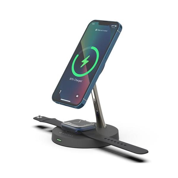 - 【返品種別A】□「返品種別」について詳しくはこちら□2023年03月 発売メーカー保証期間 1年※対応機種をお確かめの上、ご購入ください。◆HACRAY 4in1マグネット式マルチ充電スタンドは、1つのエリアでApple Watch、Qiデバイス、AirPodsをすべて充電可能なミニマル充電器です。デバイスそれぞれの専用充電器を用意する必要がなく、マグネットスタンドではさらに、MagSafe対応iPhoneも充電可能です。背面には3段階の明るさ調節が可能なLEDナイトライトを搭載しています。◆Apple Watch / AirPods / Qiデバイスを同じパッドで充電スタンド基部の充電パッドでは、QiデバイスやAirPodsのみならず、Apple Watchも充電可能です。Apple Watch専用の充電スペースを必要とせず、ひとつの充電エリアが様々なワイヤレス充電に対応するミニマル充電器です。◆充電しながら使える マグネット式スタンド充電スタンド部はマグネット式。最大15Wの電力で快適に充電できます(※1)。MagSafe対応のiPhoneやスマートフォンケースなら、マグネット吸着でスタンドに固定可能。長時間のビデオ通話やWeb会議、動画観賞をハンズフリーで楽しみながら、ストレスなくバッテリーを充電できます。※ 1 MagSafe対応iPhoneは最大7.5Wで充電されます。※ iPhone11シリーズ以前のモデルやiPhone SEシリーズはMagSafe充電に対応していません。※ スマホケースの素材や厚さによってはワイヤレス充電機能が使えないものがあります。※ ケースごとに充電効率・磁力が異なります。マグネットで固定してワイヤレス充電を行う際は、お手持ちのMagSafe対応ケース、またはマグネットシールをお使いください。◆縦・横 自由に切り替え可能マグネットで吸着しているため、くるっと回転させて縦/横の切り替えも可能です。縦でも横でも、iPhoneをお好みの状態でホールドして、用途に応じて使い分けることができます。※角度の調整はできません。◆2台同時充電 最大30W出力急速充電規格のPDとQC3.0に対応。最大30Wまで出力可能です。スタンドでiPhoneを充電しながら、同時にApple WatchやAirPods・ワイヤレスイヤホン・Androidスマホなど、充電が必要なデバイスを合計2台まで同時に充電できます。※ 出力される電力はデバイスごとに異なります。※ すべての機能を使用するには32W以上の入力が必要です。電源アダプタは同梱されません。別途ご用意ください。入力ポートにはUSB-Cを採用。同梱のUSB C to Cケーブルを使えば、最大30Wの出力で2つのデバイスを充電できます。※ ワイヤレス充電に対応するデバイスでのみ使用可能。※ 同時充電可能数:2台◆3段階調節可能 LEDナイトライトスタンド背面には、3段階の明るさ調節が可能なLEDライトを搭載。デスクでは手元を明るくし、ベッドサイドではナイトライトとして活躍します。タッチコントローラーを1回押す:ライト点灯(弱)その後、1回押すごとに 中→強→オフ の順で明るさを調整できます。◆Apple製品になじむミニマルデザイン180gの軽量で、すっきりとしたコンパクトサイズ。Apple製デバイスに馴染むシンプルなデザインです。◆安全・安心設計充電パッド部には金属異物識別機能を搭載。異常が発生し充電ができない場合は、LEDランプでエラーをお知らせします。また、使用時の過熱・過電圧・過電流に対する複数の保護回路設計がなされており、安心してお使いいただけます。CE、FCC、ROHSなど電気・電子機器に関する国際認証基準を満たした製品です。■ 仕 様 ■対応機種:・上部スタンド(マグネット式):iPhone 12/13/14 シリーズ・下部パッド:Qi 対応のスマートフォン、ワイヤレスイヤホン、ワイヤレス充電対応のAirPods/Pro、Apple Watch構成品:マルチ充電スタンド本体、専用USB-C to Cケーブル、取扱説明書および保証書※すべての機能を使用するには32W以上の入力が必要です。電源アダプタは別途ご用意ください。※商品画像内のiPhone、Apple Watchその他の機器は演出用のものです。パッケージ構成には含まれません。サイズ:105 × 138 × 105mm重量:約218g入力:PD/QC3.0、9V/3A、12V/2.5A入力端子:USB-CLEDライト:3段階調節、タッチボタンワイヤレス出力:・スマートフォン:15W /10W /7.5W / 5W・Apple Watch:3W・AirPods:2W・LEDライト:2W(3段階調節、タッチコントローラー)充電距離:<5mm※画像は使用イメージです。商品画像内のiPhone、Apple Watchその他の機器は演出用のものです。パッケージ構成には含まれません。※ MagSafe対応iPhoneは最大7.5Wで充電されます。※ iPhone11シリーズ以前のモデルやiPhone SEシリーズはMagSafe充電に対応していません。※スマホケースの素材や厚さによってはワイヤレス充電機能が使えないものがあります。※ケースごとに充電効率・磁力が異なります。マグネットで固定してワイヤレス充電を行う際は、お手持ちのMagSafe対応ケース、またはマグネットシールをお使いください。※角度の調整はできません。※出力される電力はデバイスごとに異なります。 ※ すべての機能を使用するには32W以上の入力が必要です。電源アダプタは同梱されません。別途ご用意ください。※ワイヤ