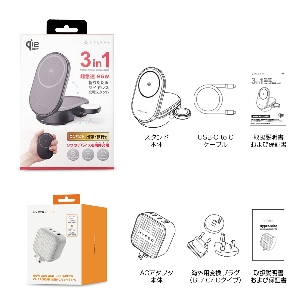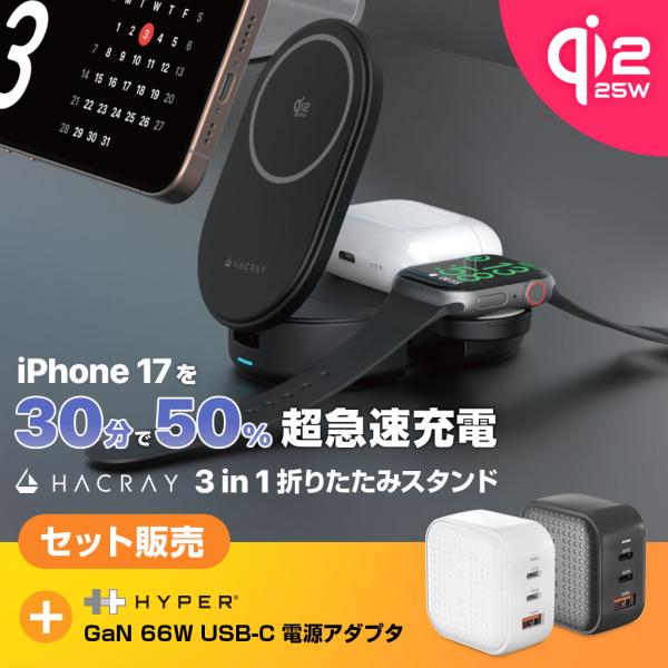 - 【充電セット】HACRAY Qi2 25W 3in1 ワイヤレス充電器 + HyperJuice 66W USB-C*2