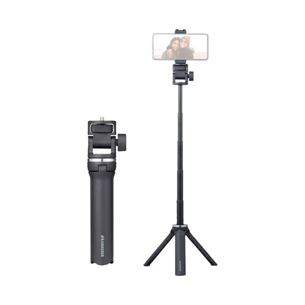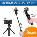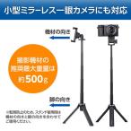 - 動画撮影やライブ配信に!スマートフォンから小型ミラーレス一眼カメラまで対応。自撮り棒にもなるマルチ撮影スタンド【商品仕様】セット内容:三脚スマートフォンホルダーアクションカメラ用マウント三脚:全高(スタンド時):約518mm全高(自撮り棒時):約544mm三脚展開時最低高:約165mm縮長:約200mm重量:約179g材質:ABS、アルミニウム、鉄推奨積載質量:約500gスマートフォンホルダー:外寸法:約W30×H81×D26mmスマートフォン固定幅:約63〜100mm重量:約25g材質:ABSアクションカメラ用マウント:外寸法:W60×H28×D31mm重量:約21g材質:ABS持ち運びに便利なコンパクトなサイズながら、小型ミラーレス一眼カメラにも対応するしっかりとした造りのマルチ撮影スタンド。脚をたたんで自撮り棒やグリップとしても使え、アクセサリーシューを備えたスマートフォンホルダーと、アクションカメラ用マウントが付属しています。多機種に対応し、自撮りやライブ配信、動画撮影の幅が広がる便利なアイテムです。セット内容自撮り棒としても使える三脚、アクセサリーシュー付きのスマートフォンホルダー、アクションカメラ用マウントの3点セット。三脚・自撮り棒・アクショングリップの3WAY三脚としても、脚をたたんで自撮り棒やアクショングリップとしても使用できる3WAY仕様。カメラ、スマートフォン、アクションカメラなど多機種に対応し、自撮りや動画撮影の幅が広がります。高さ調節が可能折りたためば持ち運びに便利なコンパクトなサイズながら、165mm〜518mmの範囲で、お好みの高さに調節が可能。様々なシーンでの撮影に対応します。しっかり握れるグリップグリップは太めで握りやすい形状。長時間でも疲れにくく、安定した撮影ができます。小型ミラーレス一眼カメラにも対応撮影機材の推奨最大重量は約500g。小型ミラーレス一眼カメラを使用した本格的な撮影も楽しめます。※転倒防止のため、スタンド使用時は機材の向きと脚の向きを合わせてご使用ください。アクセサリーシュー付きのスマートフォンホルダー約63mm〜100mm幅、厚さ約12mm以内のスマートフォンを装着可能です。ホルダー上部にはアクセサリーシューを装備しているので、マイクやLEDライトなどを取り付けて、よりハイクオリティな動画撮影やライブ配信が楽しめます。前後方向180度で調整可能台座は180度の可動域でティルトが可能。ローアングル撮影や高い位置からの自撮りなど、多様なシーンに対応できます。アクションカメラ対応アクションカメラ用マウントが付属しています。アングル調整がしやすく固定力が高い台座と、しっかり握れるグリップにより、激しい動きの撮影にも対応するアクショングリップとして使えます。機材の着脱がしやすい大型ダイヤル台座下にはカメラ取付けネジと連動した大型のダイヤルを装備しています。搭載機材やスタンド自体を回転させる事なく、指を使って素早くしっかりと固定できます。使用イメージ使用イメージ使用イメージ