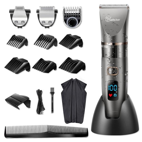Color:Gray Hatteker 電動バリカン ばりかん ヘアカッター 散髪用 コードレス 充電式 水洗い可 LED ヒゲトリマー/ラインバリカン 一台三役 グルーミングセット