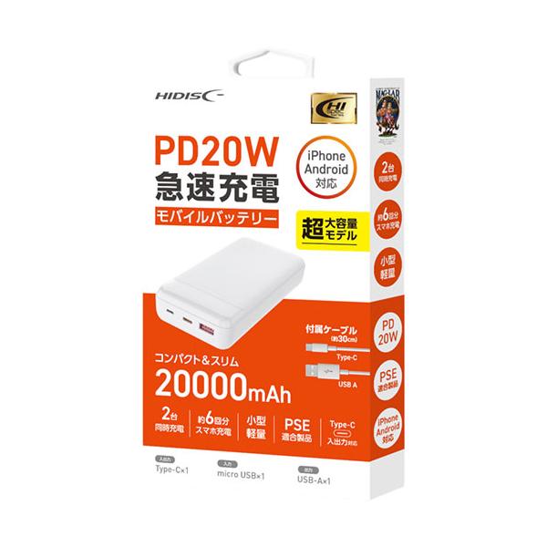 HIDISC PD20W, QC3.0対応 20000mAhモバイルバッテリー ホワイト HD3-MBPD20W20TAWH