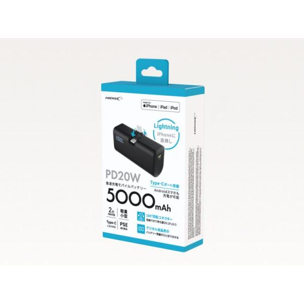 HIDISC 180°回転コネクタ直挿し Lightning 5000mAh モバイルバッテリー PD20W対応 HD4-MBTCD20W180L05BK 返品種別A
