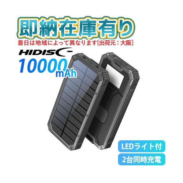 - 【返品種別A】□「返品種別」について詳しくはこちら□2025年09月 発売メーカー保証期間 6ヶ月◆電源がなくても安心! 太陽光で充電できる大容量10000mAh、頼れる相棒ソーラーモバイルバッテリー。◆コンセントが使えない環境でも、太陽光で電力を確保できます。※ソーラー充電は補助機能です。通常時はUSB充電をご利用ください。◆大容量10000mAhで、スマホなら約2? 3回分のフル充電が可能。◆USBポートは2口(5V/2.1A×2)あり、2台同時充電にも対応しています。◆入力はType-C対応で、日常使いにも便利。◆LEDライト付きなので、夜間や停電時にも活躍。◆アウトドアやキャンプ、非常用バッグにもぴったりです。◆2台同時充電可能◆LEDライト付き◆ストラップ付属◆バッテリー残量インジケーター搭載◆※パススルー非対応※写真はイメージです。※ソーラーパネル入力(蓄電)は補助機能です。本製品のソーラーパネルを使用したモバイルバッテリーへのフル充電(蓄電)を目的とした製品ではございません。■ 仕 様 ■バッテリータイプ:リチウムイオンポリマー容量:3.7V/10000mAh(37Wh)定格容量:5V/6000mAh蓄電時間:約5時間充放電回数:約500回本体寸法:W79.5×D19.5×H162mm本体質量:約269g付属品:Type-A to Type-Cケーブル(約30cm)、ハンドストラップ(約6.5 )、取扱説明書兼保証書定格入力(蓄電):Type-C:5V? 2A(Max)定格出力(充電):USB-A1:5V? 2.1A(Max) USB-A2:5V? 2.1A(Max)合計最大:5V? 2.1Aソーラーパネル入力(蓄電):1.25W 5V/250mA(Max)保護回路:ショート、過充電、過放電、過電流、過熱防止[HD4MBTCSP1L10BK]スマートフォン関連/情報端末>モバイルバッテリー>〜10000mAh