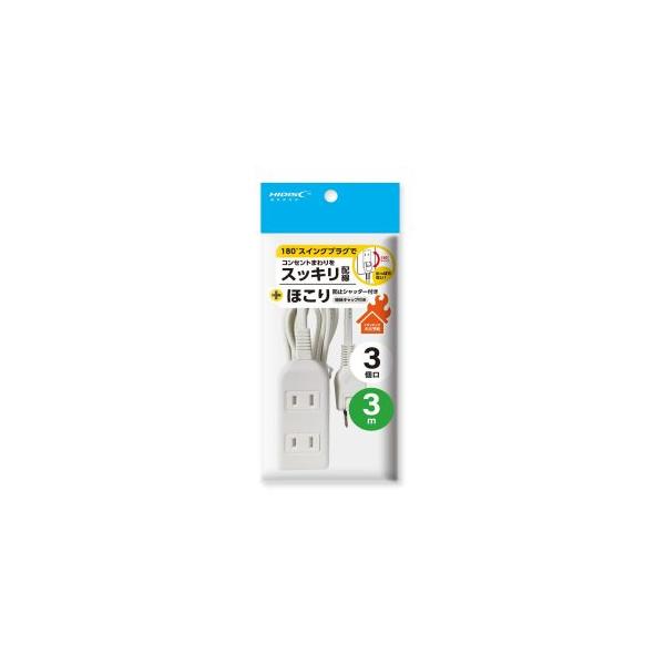 HD-T03A3MWH HIDISC 180°スイングプラグ ほこり防止シャッター付電源タップ 3個口 3m ホワイト