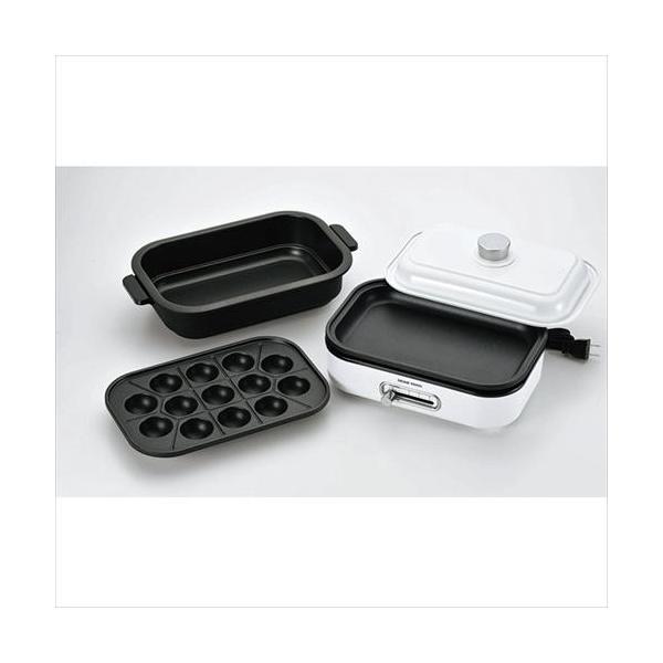 - 温度調節付き温度調節付きで調理から保温まで可能です。1人~2人用に最適な大きさおよそA4サイズで場所を取らずに調理ができます。 たこプレート、鍋、ふた付きです。 たこ焼きや鍋料理など、卓上でのお料理の幅が広がります。お手入れ簡単プレートはフッ素樹脂塗装でお手入れ簡単。 着脱式でプレートの丸洗いができます。SHP-08TP ホームスワン ソロホットプレート たこプレート、鍋付き 材質:本体/ポリプロピレン、プレート・鍋/アルミダイキャスト(フッ素樹脂塗装) 商品サイズ:本体/約33×19.5×17.5cm、プレート(内寸)/約25.5×16×2cm、たこ焼きプレート/約25.5×16cm、深鍋/26×16×6.5cm 重量:約2,400g ●仕様:AC100V-800W(50/60Hz) ●電源コード長1.4m 中国製 化粧箱入