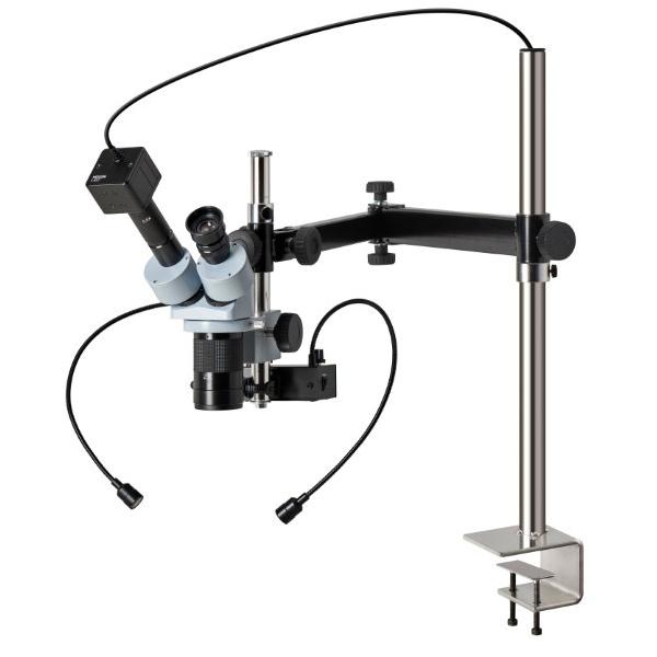 - 【商品説明】 ●コンパクト・対物レンズ切換式 & カメラで確認・保存 ●自由度の高いロングアーム(スポット照明付) ●1× / 2×切換式対物レンズのコンパクトな実体顕微鏡と、価格と性能を両立した300万画素USBカメラのセットです。 ●フレキシブルアームのスポット照明付き。 ●カメラを顕微鏡に取り付けるアダプターは、視野中央を拡大して表示するタイプです。 ●机などにクランプで取り付ける頑丈なロングアームにより、作業スペースを確保したまま使用時には引き出し、使用後は端へ避けるといった使い方が可能です。 【商品スペック】 ●作動距離(mm):顕微鏡…150/80、カメラ…145/90 ●視野(mm):顕微鏡…18/9/4.5φ、カメラ…14×11〜4.2×3.2 ●倍率:顕微鏡…10/20/40×、カメラ…38/69/130倍 ※ 【入数】 1式 LKIT992