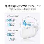 バッテリーは充電ケース併用で最大50時間再生可能。さらに10分充電で最大4時間使用でき、外出前の短時間でも安心です。長時間利用でもバッテリー切れを気にせず楽しめます。