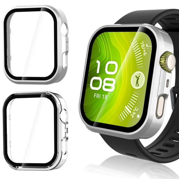 WD&CD Huawei Watch Fit 4 Pro 対応 カバー+フィルム 2枚セット Huawei Watch Fit 4 Pro 対応 一体型 フルカバー ガラスフィルム PCフレーム 軽量 薄型 擦り傷防止 全面保護ケース (クリア+シルバー)