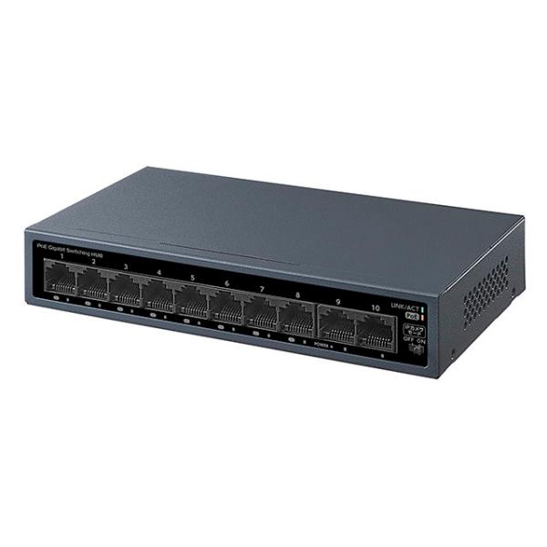 - IPカメラモード搭載!合計60W給電可能10ポートL2アンマネージGigabit PoEハブ「IEEE802.3at準拠 10ポートL2アンマネージGigabit PoEハブ?」BSH-GP210は、PoE給電に対応したポートを8つ、アップリンクポートを2つ搭載したGigabit対応PoEスイッチングハブです。1ポートあたり最大30W、全体では合計60Wまで給電可能です。全ポートGigabit対応で、高速通信が求められる機器に適しています。IPカメラとの接続時に役立つ機能をまとめた「IPカメラモード※」を搭載しており、任意にON/OFFを切り替えることが可能です。また、ファンレス設計かつ電源内蔵でありながら、コンパクトな筐体サイズにこだわりました。※IPカメラモードを有効にすると、通信速度が10Mbpsに制限されます。■PoE給電対応ポート×8 、アップリンクポート×2 を搭載IEEE802.3at準拠のPoE対応ポートを8つ搭載しています。1ポートあたり最大30W、装置全体では合計60Wまで給電可能です。 PoE受電機器にLANケーブル1本で給電可能なため、電源のない場所へ電源工事などを行わずに気軽に機器を設置できます。アップリンクポートは2つ搭載しています。これにより、インターネット接続だけでなくNVR等の機器にも接続しつつ、8つあるPoE対応ポートすべてで給電することが可能です。■IPカメラ接続に有用な「IPカメラモード」のON/OFF切替が可能IPカメラとの接続時に有用な機能をまとめた「IPカメラモード」を搭載しています。この機能をONにすることで、下記の機能がまとめて有効になります。(1)通信速度を10Mbpsに制限し、100M以上先の機器に給電と通信を行う「遠距離/10Mbps」遠距離/10Mbpsを有効にすると、PoE 給電対応 LAN ポート(1 〜 8)のリンク速度を 10Mbps(10BASE-T) に制限します。これにより通常 100m までが限度の給電距離を最大で250m先の機器に対して給電と通信の確立が見込めます。※PoE給電で動作する機器との接続では、事前に動作検証することを推奨します。※すべての機器、環境での動作を保証するものではありません。(2)給電先の機器とのリンクが切断された場合、一度給電を止めてから給電再開することで不具合の解消を図る「PD ALIVE」PD ALIVEは、給電されつつもリンクが失われた接続機器へのPoE給電をOFF/ONすることで、接続機器の再起動を促します。スイッチが自動的に接続機器の復旧作業を行うため、ダウンタイムの短縮や復旧費用の削減を見込めます。※接続されたPoE機器の動作状況確認はPingによるものではありません。※PD-ALIVE使用時は、マルチキャストやユニキャストといった1対複数機器への通信は行わないでください。PoE機器が接続されたポートのパケットの送受信により、接続されたPoE機器の動作状況を確認しています。■ACアダプター不要の電源内蔵タイプACアダプターが不要な電源内蔵タイプのため、コンセント周りをすっきりさせることができます。■壁掛け設置に対応!壁掛け用フックホールが商品背面にあり、壁面にネジを取り付けることで壁面へ設置ができます。※壁面取り付けネジは添付しておりません。メーカーホームページを参考に別途ご用意ください。