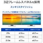 - ワイド液晶ディスプレイ 23.8型/1920×1080/HDMI、DisplayPort/ブラック/スピーカー:あり/100Hz対応で視認性アップ! 輝度:250cd/m2/応答速度:4ms/最大消費電力:25W/■100Hz対応の23.8型のワイド液晶ディスプレイです。100Hzに対応しているので残像感が抑制され、視認性が向上します。「DisplayPort」「HDMI」の入力端子を搭載し、ケーブルも標準添付しているので、さまざまな機器と接続して使用できます。3辺フレームレスパネルを採用。■一般的な60Hzのディスプレイより、約1.6倍高速に映像が書き換わります。画面のスクロールもスムーズになるため、残像感が軽減され、視認性が向上します。また、激しい動きの映像でもなめらかに楽しめます。※100Hzの出力に対応した機器が必要です。■パソコンとの接続に便利なDisplayPortとAV機器などの接続に便利なHDMI端子を搭載しています。さまざまな機器と接続してお使いいただけます。さらに、DisplayPortケーブル、HDMIケーブルを標準添付しており、ご購入後すぐにお使いいただけます。■パネルとフレーム(枠)による段差がないフラットなフレームレスパネルを採用しました。極細フレームですっきりした印象を与え、マルチディスプレイにもオススメです。