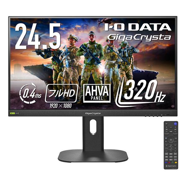 - 【返品種別A】□「返品種別」について詳しくはこちら□■新製品■2025年11月 発売メーカー保証期間 5年【ご購入後のお問い合わせにつきまして】購入後の初期不良・お問い合わせにつきましては、メーカーサポートへお問い合わせください。※詳しくはメーカーページをご確認下さい。I・O DATA サポート:電話でのお問い合わせ050-3116-3019受付時間 9:00〜17:00 月〜日曜日(年末年始及びメーカー夏期休業日を除く)チャット・メールでのお問い合わせはサポートページよりご確認ください。FPSゲームで最大限パフォーマンスを発揮! AHVAパネル採用のプロユース向けゲーミングモニター◆最大320Hzの超高速リフレッシュレート対応DisplayPort接続で最大320Hzの超高速リフレッシュレートに対応。1秒間に最大320回映像を書き換えができるため、一般的な60Hzモニターの約5.3倍、240Hzモニターの約1.3倍の滑らかさを実現。FPSゲームでは、正確なエイムやリコイルコントロールをサポートし、激しい視点移動や接敵時でも高い視認性を維持します。※ご利用いただけるリフレッシュレートの上限は出力機器により異なります。※320Hzの出力に対応した機器が必要です。※HDMIは最大240Hz対応です。◆Clear AIM機能でブレを低減し、よりクリアな視認性を! 一般的に、液晶パネルのある色から別の色へ変化する際に、色変化にわずかに時間がかかり、それが映像描写の遅延となりブレにつながります。Clear AIM機能は、リフレッシュレートに応じてバックライトを点灯/消灯させ、動きの激しい映像の「ブレ(モーションブラー)」を低減できます。点滅のタイミングはメーカー独自チューニングにより最適化されており、より高い視認性と正確なプレイングをサポートします。◆ティアリング(映像のずれ)のないゲームプレイを実現! 本商品は各種可変リフレッシュレート技術に対応および認証を取得しています。ゲーム内FPS値が変動することによって発生する「ティアリング(映像のずれ)」、「スタッタリング(カクつき)」に対してモニターも合わせてリフレッシュレートを変動(可変)させることで「映像のずれ、カクつき」の発生を抑え、快適なゲームプレイを体験いただけます。また、“VESA AdaptiveSync” に対応しNVIDIA社G-SYNC Compatibleの認定を受けたディスプレイです。スムーズでティアリング(映像のずれ)のない快適な映像でゲームを楽しむことができます。2025 NVIDIA、NVIDIAロゴ、NVIDIA G-SYNCは米国および他の国におけるNVIDIA Corporationの商標または登録商標です。※G-SYNC CompatibleはDisplayPortのみ対応しています。※G-SYNC Compatible機能時、スルーモードはONに固定されます。◆オーバードライブ機能で応答速度0.4ms[GTG]を実現オーバードライブ機能をONにすると、画面の応答速度を0.4ms[GTG]に向上させることができます。動きの速いシーンの残像感を低減し、動きの激しい映像やゲームでもクッキリした映像をお楽しみいただけます。※320Hz/オーバードライブレベル3設定時/Clear AIMレベル3設定時◆スルーモードで内部フレーム遅延が約0.05フレーム(約0.15ミリ秒)超解像機能やオーバードライブ機能を有効にしていても、内部遅延時間が約0.05フレーム(約0.15ミリ秒)※1を実現(スルーモードオン時)。特に動きの速いゲームでは、操作と表示のズレが少なく、威力を発揮します。また、現在の設定の遅延時間を画面に表示して確認することができます。※フレーム遅延時間とは、映像処理による信号遅延時間。(メーカー独自測定結果による)※1 フルHD/リフレッシュレート320Hzの時の値。◆お好みの高さ、角度にできるスタイリッシュな「ゲーミングスタンド」本商品は「ゲーミングスタンド」を採用! 見やすい位置に高さや角度を調整することで、目や肩の疲れやストレートネック対策の一つとしても効果的です。お好みの姿勢をとれるので、ゲームや動画を見たりと長時間ディスプレイに集中しやすくなります。また、ディスプレイを移動させたりした後に、お好みの高さに再度合わせやすいようスタンドに「目盛り」付き! 場所を移動させたり、他の人が使った後でも、再度お好みの高さに合わせることが簡単です。◆超薄型台座で、デスクをもっと広く快適に! ノートPCやキーボードを安定して収納できる超薄型スタンド。奥行を取らない設計で、限られたスペースでもすっきり収まり、デスク周りを広々と使えます。壁際までぴったり設置できる直角デザインで、省スペースを最大限に活かせるのもポイントです。◆コンテンツに応じた映像表示ができる「画面モード」それぞれのコンテンツに適した設定がプリセットされています。モードを選ぶだけで、コンテンツに応じて見やすく美しい画質を表示することができます。また、お好みに応じて、各モードに設定されている画質の調整も可能です。GigaCrystaシリーズでは、ゲームジャンルに合わせて画面モードを切り替えられる機能を搭載。中でも「FPSモード」は、色の鮮やかさよりも“敵の見やすさ”を重視した設定で、快適なプレイ