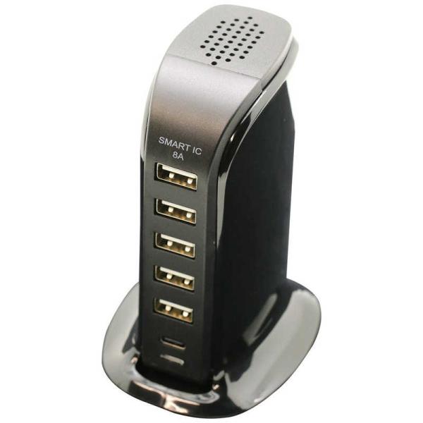 - 最大6台(Type-Aポート×5、Type-Cポート×1)の機器を同時充電可能な6ポートタイプのAC充電器です。最大出力8A・Smart IC搭載により、どのポートからでも最適な電流値で充電が可能です。スマートフォンとタブレット等の組み合わせで同時充電が可能です。