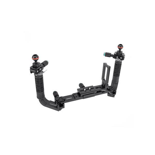 - 水中撮影機材で人気のINON(イノン)から撮影に必要なグリップやベース、ダイレクトベース等を組み合わせたオールインワンセット! イノン「クイックシューシステム」のメインベース、L型ブラケット、W27セットx4、D5ホルダーx2、D5ランヤードプレートx2、ダイレクトベースIIIx2がセットになっています。 パーツを自由自在に分離・合体させる事が出来るので、水中ではライティングの自由度が飛躍的に向上し、陸上では分離する事で持ち運びや収納に圧倒的な利便性を生み出します! また、締め込みの甘さによる分離などを防ぐ為、クイックシュークランプには視覚的に確認ができる機能を搭載! 緩んでいる場合には「赤」が表示され、しっかり締め込めている場合には「緑色」が表示される様になっているので安心です。 さらに、セットになっているクイックシューL型ブラケットはカメラを縦位置にセッティングする事が可能! セッティングした器材を縦に傾けて撮影する必要が無く、自然な体制で縦位置の撮影を行う事が出来ます! ◆サイズ:W375.6 x H205.1 x D96.7mm ◆本体重量:85g(陸上) / 約553g(水中) ◆本体材質/表面処理:耐蝕アルミ合金 / 硬質アルマイト、等