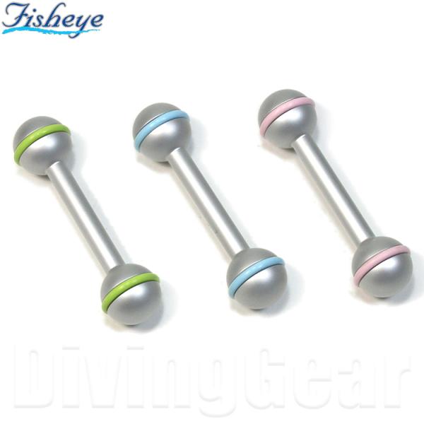 人気の水中撮影機材メーカーFisheye(フィッシュアイ)のパールシルバーの輝くボディに鮮やかなカラーのOリングを取り付けたカメラアーム。