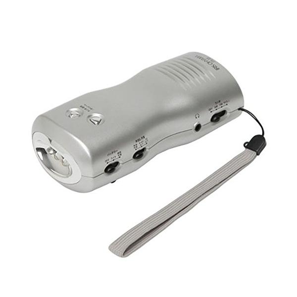 ・仕様:使用電池:リチウムイオンポリマー電池(内蔵) 電池容量:450mAh 定格出力:3.7V/500mA 最大出力:1.85W 手回し充電(ダイナモ) 定格出力:4.2V/500mA 最大出力:2.1W LEDライト:白色3灯 ラジオ:AM/FM 緊急用サイレン