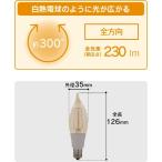 - 【返品種別A】□「返品種別」について詳しくはこちら□メーカー保証期間 1年※人感センサー、明るさセンサー付などの自動点灯器具では使用できません。※商品の特性上明るさや光の色にバラつきが出る場合がございますので、予めご了承ください。◆琥珀調ガラスがきらめくレトロな明かり◆ペンダントライトやシャンデリアなどに適したインテリア性のあるデザインです。◆白熱電球のように光が広がる◆密閉形器具にも対応(※器具の種類によって、寸法が合わない、熱がこもる等の要因により、使用できなかったり、寿命が短くなる場合があります。)■ 仕 様 ■全光束:230lm(小形電球25W形相当)光色:キャンドル色相当配光角:300度配光:全方向タイプ口金:E17密閉形器具:対応調光器:非対応断熱材施工器具:非対応※断熱材施工器具SB、SGI、SG形表示器具では使用しないで下さい。定格消費電力:1.8Wエネルギー消費効率:127.8lm/W定格寿命:20000時間寸法(約):外径35×全長126mm質量:25g[LDF2CGE17FK]アイリスオーヤマ生活家電>電球・管球>LED電球>LED シャンデリア形・LED 装飾電球
