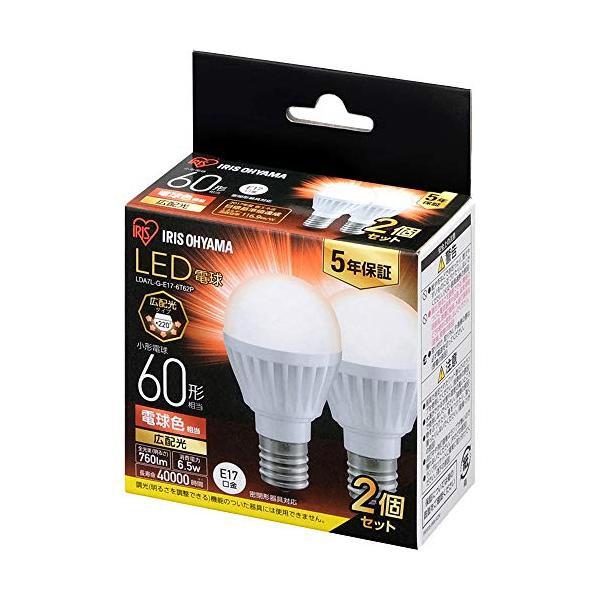 - > > 当店のおトクなクーポン・ポイントアップ情報はこちらから < <※各キャンペーン・各クーポンの開催期間・獲得条件・ポイント倍率等を必ずご確認ください。■商品説明トップランナー制度対応、2017年度省エネ法目標基準値達成のLED電球です。白熱電球のように広範囲に明るい広配光タイプなので、トイレや階段などの照明に最適なLED電球です。口金サイズがE17口金なので、照明器具を替えることなくご使用いただけます。●光色:電球色相当●定格消費電力:6.5W●定格入力電流:0.113A●全光束:約760lm●配光角:220°●設計寿命:40000h●電源:100V(50/60Hz共用)●使用場所:屋内用●ランプ全体の明るさ:小形電球60形相当●口金サイズ:E17●密閉器具:対応●エネルギー消費効率:116.9lm/W●保証期間:お買い上げ日より5年間・パッケージサイズ(横 x 奥 x 縦) : (約) 80 x 40 x 80 (mm)・パッケージ重量 : 約 110 g・商品サイズ(横 x 奥 x 縦) : (約) φ38 x - x 74 (mm)・商品重量 : 約 46 g・素材 : アルミ、 ポリカーボネート、 ナイロン・保証期間 : 5年・商品名 : アイリスオーヤマ LED電球 E17 広配光2P 電球色 60形(760lm) LDA7L-G-E17-6T62P -・JANコード : 4967576408158【商品保証に関して】初期不良・修理・お問い合わせにつきましては、メーカー様より直接ご対応をしていただくようになっております。※メーカーにて交換・修理の際に購入店の証明が必要になる場合がございます。なお、弊社の納品書が購入証明としてご使用いただけますのでお手元にご用意をお願いいたします。お持ちでない方はお問合せくださいませ。=======================================アイリスコール(TEL)0120-211-299【受付時間】平日 9:00~17:00土・日・祝日 9:00~12:00 / 13:00~17:00=======================================■ ご注意 ■・ ご注文のタイミングにより、納期がかかる、又は完売などの場合もございます。・ 商品の情報/詳細、画像について保証は致しかねます。・ 画像はイメージです。商品以外が含まれる、又は商品と異なる場合があります。・ 必ずメーカーホームページなど合わせてご確認ください。・ ご注文確定後のキャンセル・返品・交換は出来かねます。・ 北海道、沖縄、その他離島は配送致しかねます。