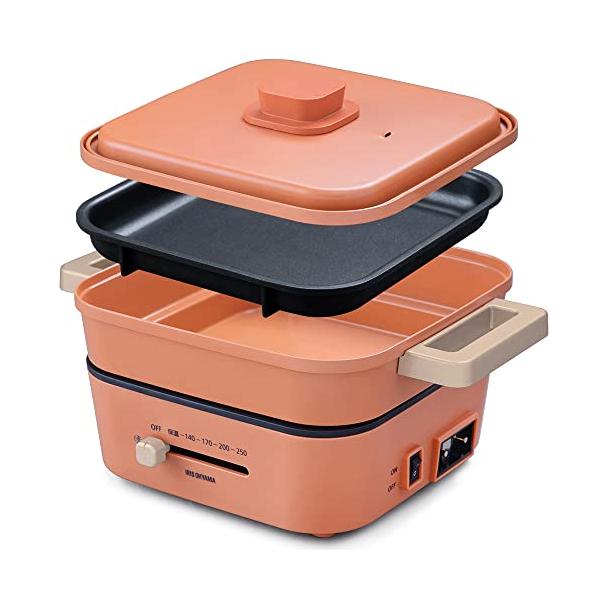 - 2枚プレートオレンジ/-/IGU-P2-D・Color:オレンジStyle:2枚プレート・パッケージ個数:1・商品サイズ(cm):平面プレート装着時:幅約24×奥行約24.5×高さ約9.7/深なべ装着時(ふたを含む):幅約33×奥行約25×高さ約17.3(電源コードを除く)・電源:AC100V(50/60Hz)・定格消費電力:900W・温度調節範囲:保温〜約250℃・電源コード長さ:約1.7m煮る、炊く、焼くがこれ1台。 食卓でアツアツ料理が楽しめます。 煮物やなべ料理などに便利な深なべ、焼肉やお好み焼きなどが楽しめる平面プレート付きです。