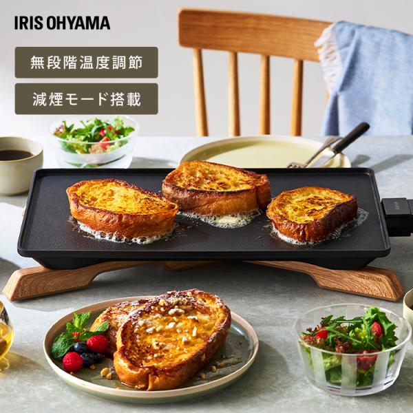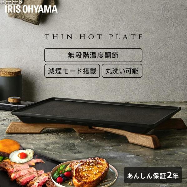 - 落ち着いたデザインの薄型ホットプレートです。◆ヒーター内蔵プレート張り巡らされたヒーターで、ムラなく温めます。◆減煙モード搭載油分の多い食材を調理する際は、目盛を減煙に合わせてご使用いただくと、油煙の発生を抑制できます。◆無段階温度調節【HI】焼肉、野菜炒め、焼きめし、ステーキ【MID~HI】焼きぎょうざ、お好み焼き、焼きそば、もんじゃ焼き、ハンバーグ(途中で温度を下げる)【LOW~MID】目玉焼き、薄焼き卵、ホットケーキ※、クレープ、フレンチトースト【WARM】保温したいとき※:ホットケーキを作るときは、【LOW】で15分以上予熱を行ってください。◆スマート収納プレートは洗ってそのまま立てかけ可能。薄型プレートと折りたためる脚なら、スマートに収納可能。◆簡単お手入れプレートは丸洗いOK。フッ素加工を施してあるので、こびりつきにくくお手入れ簡単。●電源AC 100V(50/60Hz共用)●定格消費電力1300W●コード長さ1.8m●製品寸法(cm)幅約46.5×奥行約26.6×高さ6.2●製品質量(下記付属品含む)約2.6kg●コーティングフッ素樹脂コーティング●付属品コントローラー、開閉式脚 (検索用:薄型・ホットプレート・薄型プレート・丸洗いOK・フッ素コート・減煙モード・折りたたみ脚・温度調節4段階・焼肉・ステーキ・お好み焼き・焼きそば・餃子・ホットケーキ・クレープ・4967576651592・アイリスオーヤマ) 最強翌日配送対象商品に関するご案内 最強翌日配送対象商品・対象地域に該当する場合は最強翌日配送マークがご注文カゴ近くに表示されます。 最強翌日配送可能なお支払方法は【クレジットカード、代金引換、全額ポイント支払い】のみとなります。 下記の場合は最強翌日配送対象外となります。 ●15点以上ご購入いただいた場合 ●時間指定がある場合 ●ご注文時備考欄にご記入がある場合 ●決済処理にお時間を頂戴する場合 ●郵便番号や住所に誤りがある場合 ●最強翌日配送対象外の商品とご一緒にご注文いただいた場合 ●お届け先住所文字数が40文字以上の場合お届け先が沖縄・離島の場合、お届け日時のご希望に沿えない場合がございます。予めご了承ください。 ▼雑草が生える前の今がチャンス! \”朝食”がもっと楽しみになる調理家電特集!/