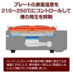 ・プレートの表面温度を210〜250℃に一定化させることで、肉の脂が煙化することを抑制します。また、炎の上に肉の脂を落とさず、スムーズに水皿に落とすことで煙の発生を抑制します。