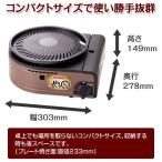 ・本体サイズ:幅303×奥行278×高さ149mm/プレート外径:233mm/商品重量:約2.0kg/カラー:ブロンズ&ブラック/材質:本体 鋼板、プレート アルミダイカスト、水皿 鋼板、バーナー 耐熱アルミダイカスト、点火つまみ ABS樹脂/最大発熱量:1.0kW 900kcal/h/連続燃焼時間:約217分 気温20〜25℃のとき強火連続燃焼にてカセットボンベを使い切るまでの実測値/点火方式:圧電点火方式/安全装置:圧力感知安全装置 他/容器着脱方式:マグネ - 楽天での商品説明(URC)