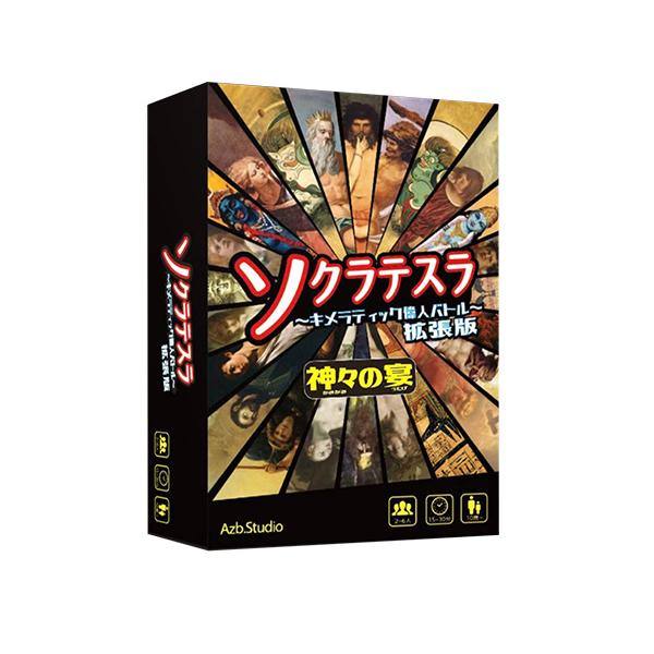 - ※この商品は【レターパックプラス便発送可】お届けの日時指定はできませんが、 配達時ご不在の場合は再配達が可能です。また、郵便の速達なみの速さでお届けできます。 【仕様】 プレイ人数:2-6人 プレイ時間:15〜30分 対象年齢:10歳以上 [デザイン] System: AzbStudio [内容物] カード 66枚 説明書 1枚 【詳細】 「ソクラテスラ拡張版〜神々の宴〜」は、様々な偉人を組合わせて戦わせる、キメラ偉人カードゲーム「ソクラテスラ」の拡張版です。 世界各地の神話から「ゼウス」などの神が新たに登場し、圧倒的なインパクトを持つカードを使った、異次元の戦いを楽しむことができます。