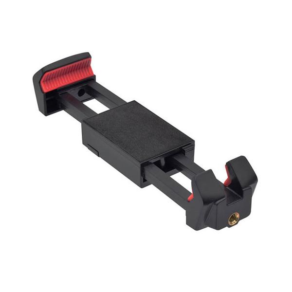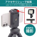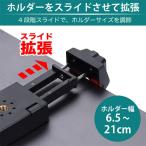 スマホ・タブレット対応三脚固定ホルダー。幅6.5〜21cm・厚さ約1cmまで対応。1/4インチネジ穴を底面・背面に搭載。