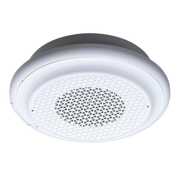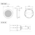 - 「定 格」 ・スピーカーユニット:9 cm防滴型コーンスピーカー ・定格入力:1 W / 3 W ・出力音圧レベル:92 dB 1 W(1 m) ・周波数特性:150 Hz〜20 kHz ・入力インピーダンス:10 kΩ(1 W)、3.3 kΩ(3W) ・入力端子:スクリューターミナル ・防水保護等級:IPX4準拠(JIS C 0920) ・外形寸法:φ180 mm×奥行最大62 mm ・質量:約0.8 kg ・仕上:ピュアホワイト (マンセルN9近似、日塗工HN-90(2015年)近似) ・材質:キャビネット:PP複合樹脂 ・天井穴開口寸法:φ150±3 mm ・取付可能天井材厚さ:1 mm〜20 mm●スプリングクランプ方式を採用。 ●天井固定後、両手が使えるので、結線が容易。