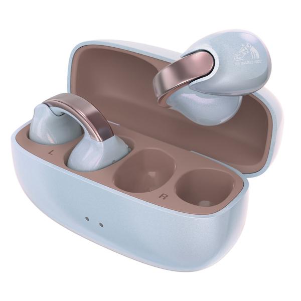 耳をふさがないイヤーカフタイプの完全ワイヤレスイヤホン。装着しやすいフレキシブルアジャストで、軽く快適な着け心地。