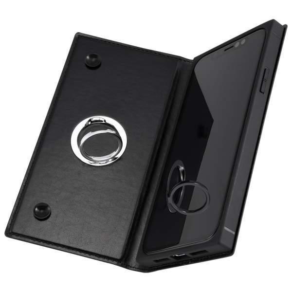 iPhone 11 手帳型 ケース カバー KAKU 耐衝撃 衝撃吸収 [ ストラップ ホール 付き 通し穴 ] スクエア 軽量 リング付360 ピタッとカバー ブラック/ブラック