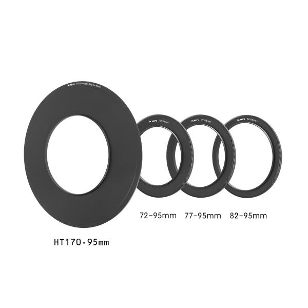 HT 170mmフィルターホルダー用のアダプターリング(フィルター径95mm用)とステップアップリング(72mm/77mm/82mm用)の4点セットです。KANIのステップアップリングはネジ切りの工作精度にもこだわっています。レンズとフィルターホルダーの脱着や固定時の安定性に直接関わるので、その精度は重要です。お手持ちのレンズに合わせてご検討ください。