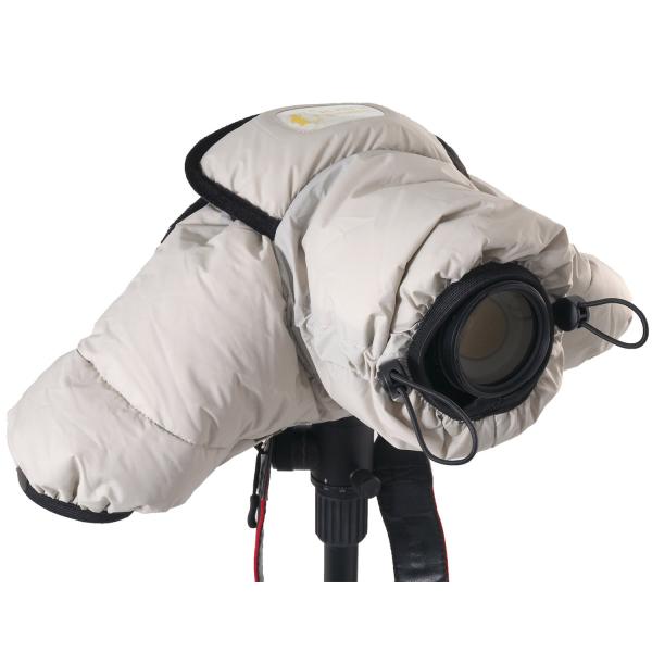 寒冷地での撮影に最適。カメラをすっぽり覆うフェザー入の防寒カバーです。