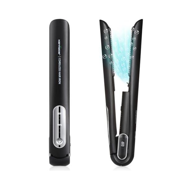 ・コードレス&マイナスイオン搭載:このKeyniceコードレスヘアアイロンは、コードレスなので、コンセント不要でどこでも手軽に使えます。コンパクトで軽量、出張や旅行などに1本があるととても便利!1700万個/cm3以上の高濃度マイナスイオンを発生させ、髪の内部までしっかり潤いを届けます。静電気を抑えることで、パサつきや広がりを防ぎ、なめらかでツヤのある仕上がりを実現します。乾燥や摩擦によるストレスから髪を守り、健康的な輝きをサポートします。