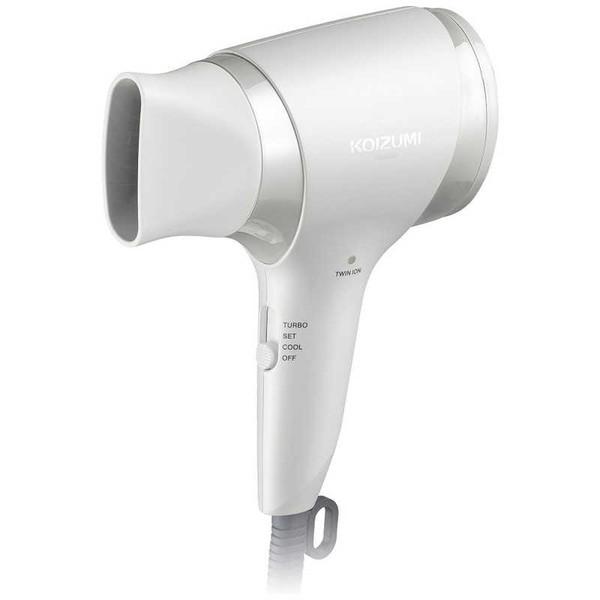 - コイズミ KHD9740W マイナスイオンヘアドライヤー コイズミビューティ ホワイト 発売日:2022年10月20日●軽量・コンパクト設計軽量約360gミニタイプ。●小さくても高速乾燥!大風量1.6立米/分。パワフル1200W。●ツインマイナスイオン搭載マイナスイオン2ヵ所から発生。 【仕様】本体W×D×H(mm):139×68×168重量(g):360原産国:中国電源:AC100V 50/60Hz共用消費電力:1200W風量:1.6立米/分メインスイッチ:TURBO-SET-COOL-OFF風量調節:2段階(TURBO-SET)コードの長さ:1.7m