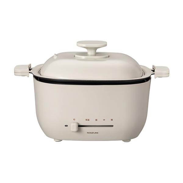 - コイズミの1人前にちょうど良い「わたし専用」ミニグリル鍋 ひとりご飯をもっと楽しく、もっとおいしく。 卓上で調理から食事までこれ1台で楽しめます。 ☆使い方は焼く、煮る、炒める、茹でるの4通り ミニグリル鍋は1人前の調理にぴったりなミニサイズ。卓上で、野菜炒めやビビンバ、餃子や鍋、パスタや即席ラーメンなど、焼く/煮る/炒める/茹でるの調理に幅広く使えます。 ☆コンパクト×深底で調理ラクラク 幅約26cmのコンパクトサイズながら、深底なので油はねや煮こぼれの心配もありません。 必要な食材と調味料を入れるだけで調理の手間がかかりません。 ☆そのまま食べられる 調理が完了したらもうそのまま食べるだけ。 料理をお皿にうつす手間もいらず、保温機能付きなのでいつでも温かいまま食べることができます。 ◎ミニグリル鍋の特長 ☆耐久性に優れたセラミックコーティング 焦げ付きや錆が気になる方へ。なべ表面には、傷が入りにくく・耐熱性にも優れたセラミック成分主体の表面処理を施しています。摩擦や熱から表面を守ります。 ☆保温から高温まで 温度調節 料理に適した温度であたためます。 温度調節は約70~200℃(保温、弱、中、強)まで対応。 本体下の温度調節レバーを左右にスライドするだけでお好みの温度に調節できます。 ヒーター通電時には通電ランプが点灯してお知らせしてくれます。 ☆毎日使いやすいコンパクトサイズ 本体約幅26cm×高さ16cm(×奥行 約20.5cm)のコンパクトサイズ。 置きっぱなしでも、収納しても邪魔になりにくいサイズ感です。 ☆収納もらくらく 本体が小さいだけでなく、付属品はすべて本体の中に収納できます。 ◎使い勝手の良い機能 ☆マグネットプラグ すぐ抜けるから万が一引っ掛かってても安心。収納時もスッキリ収納出来て便利です。 ☆取っ手付き なべだけ外して取り出しやすく。運ぶ際やお片付けにも便利です。 ☆なべだけ そのまま冷蔵庫へ なべだけをそのまま冷蔵庫にも。作り置きなどに活躍します。 ☆置きやすいふた 卓上にも置きやすい形状です。 ☆滑り止め付き 本体底面に滑り止めがあるので調理中も食事中も安心。 ☆丸洗いOK なべとふたは水洗いで清潔に。 セット内容 本体、なべ、ふた、電源コード、取扱説明書、保証書 電源:AC100V 消費電力:650W 安全装置:温度ヒューズ240℃ 温度調節:保温 〜200℃ ヒーター:シーズヒーター コードの長さ:1.5m 本体サイズ:約260(W)×205(D)×160(H)mm 質量:約1.5kg(電源コード含む) プレートサイズ:約260(W)×200(D)mm(取っ手部含む)