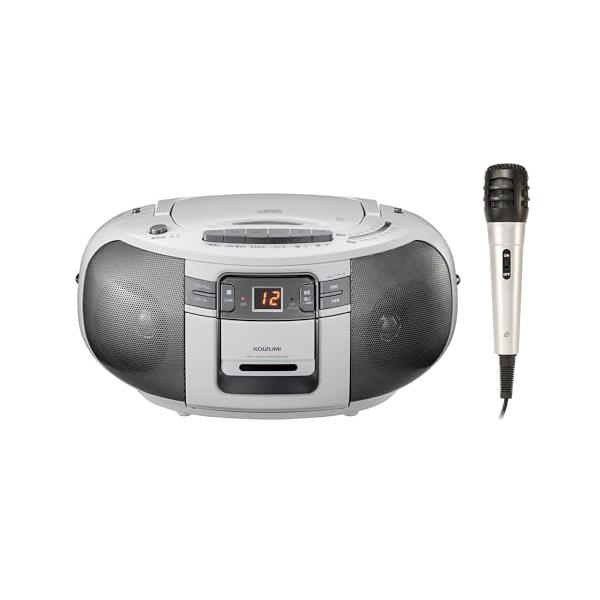- マイク付属 マイク音量調節可能 ○外部入力端子 ○CDプログラム20曲、リピート機能 ○重低音機能 ○AM/FMラジオ受信 ワイドFM対応 ○マイク付属 マイク音量調節可能 商品仕様 本体サイズ(幅)31 × (奥行)24.5 × (高さ)15.5cm 本体重量約2000g CDプレーヤー部CD-R/-RW再生対応・○ CDプレーヤー部プログラム演奏/曲数・20曲 CDプレーヤー部リピート・1曲/全曲 チューナー部受信バンド・AM/FM ワイドFM対応 カセット部対応テープ・ノーマル カセット部オートストップ・○ 実用最大出力実用最大出力・1W + 1W 機能重低音、音声入力端子、ヘッドホン端子、マイク端子、内蔵マイク 電源乾電池単2形アルカリ乾電池×6本 電源AC100V 50/60Hz(付属電源コード使用時) JANコード4981747086341 本体保証ご購入日から1年間KOIZUMI(コイズミ)ステレオCDラジカセマイク付き / ホワイト マイクが使えて録音も可能。 歌(カラオケ)の練習や語学学習にもおすすめです。家庭用電源でも乾電池でも使えるので、いろんな場所で活躍します。 ※電源コード付属、アルカリ乾電池(別売) マイクが使えて広がる楽しさ。 マイクボリュームが調節可能で、重低音機能も搭載。 録音も可能。 CD、ラジオ、マイクからカセットテープに録音できます。 CDとマイクの両方から同時に録音できるので、歌(カラオケ)の練習に便利です。 使いやすい操作部 ●わかりやすい日本語表示 ●ラジオAM/FM受信 ワイドFM対応 マイク端子、マイク付き、CD-R/-RW再生、プログラム20曲、リピート演奏、オートストップ、ラジオAM/FM、ワイドFM対応、内蔵マイク、外部入力 本体サイズ 安心のメーカー保証 ★お気に入りに登録
