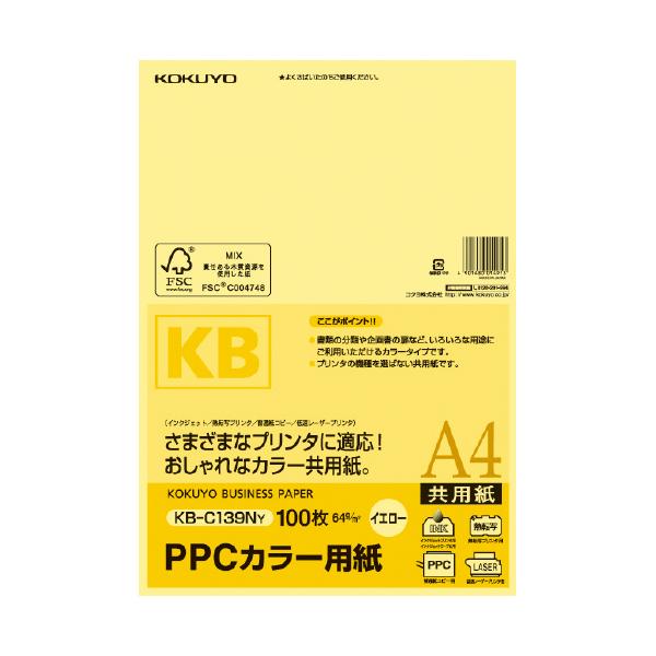 A4コピー用紙 コクヨ PPCカラー用紙(共用紙) FSC認証 A4 100枚 64g平米 黄 KB-C139NY