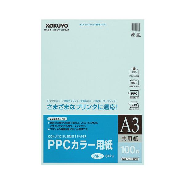 コピー用紙 コクヨ PPCカラー用紙(共用紙) A3 100枚 64g平米 青 KB-KC138NB