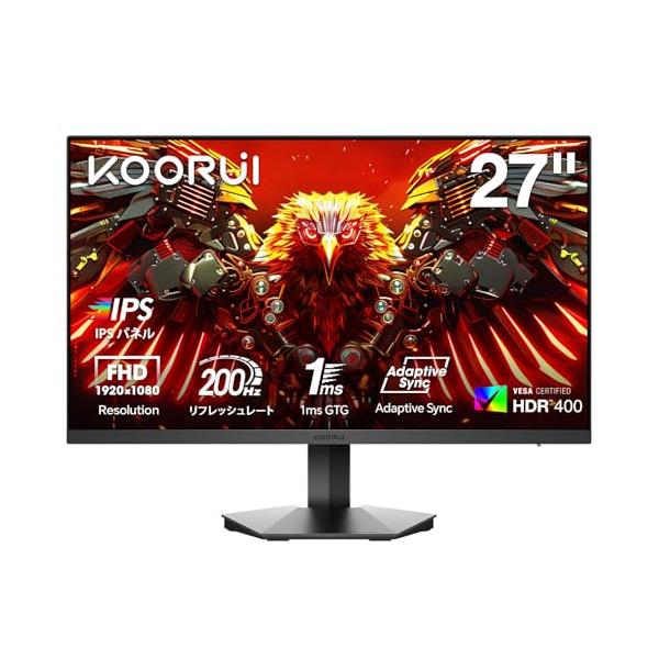 KOORUI ゲーミングモニター 27インチ IPS 200Hz 1ms GTG HDR400 非光沢 フルHD 90%DCI-P3ブルーライト軽減