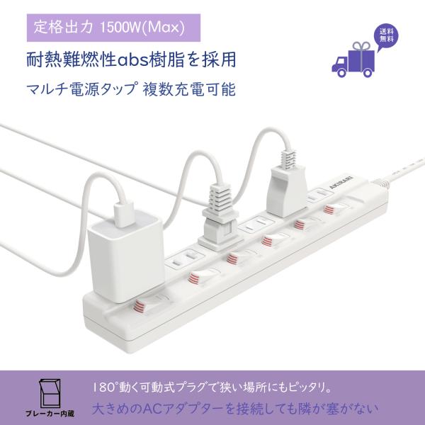 - 📌 多機能電源タップ 6個のAC差込口を備え、複数の機器を同時に接続可能な便利な電源タップ。 ランプのないシンプルなデザインで、光の干渉を減少。 防塵シャッター付きで、ホコリの侵入を防ぎ、使用しないときも安心です。 雷サージ保護機能を搭載し、落雷や突発的な電圧変動から機器をしっかりガード。 家庭用はもちろん、オフィスや作業場など様々なシーンで活躍します。 電源タップ 商品詳細 定格容量 15A 125V(合計1500Wまで) ケーブル長さ 1、2、3m カラー ホワイト プラグ 2P(絶縁キャップ付きスイングプラグ) 差込口 AC*6 本体寸法 約W270×H45×D26mm 本体重量 約290g 使用地域 日本国内 認証 電気用品安全法(PSE)技術基準適合品 保証 1年間 特徴 🔌【合計6口のACコンセント搭載】 ACコンセントを合計6口備えた大容量タイプの電源タップです。複数の家電製品や機器を同時に接続できるため、家庭内はもちろん、オフィスや作業スペース、共有エリアなど、多くの電源が必要な場面で活躍します。テレビ、パソコン、プリンター、モニター、扇風機など、さまざまな機器をこれ一台でまとめて給電可能です。 🔛【各コンセントに独立スイッチ搭載】 各コンセントごとに独立したスイッチが搭載されているため、電源の抜き差しをせずに個別にON/OFF操作が可能です。これにより、差込口の劣化を防ぎつつ、必要な機器だけに通電することができ、待機電力を削減する省エネ効果も期待できます。たとえば、扇風機だけを使いたい時や、モニターだけを一時的にOFFにしたい時など、ボタン一つで簡単操作。 🚫【ランプなしスイッチ】 各スイッチにはあえてインジケーターランプを搭載していないシンプル設計。夜間や暗い部屋でも光が気にならず、就寝中の眩しさを防げます。特に寝室や子供部屋での使用に最適で、睡眠を妨げない快適な環境を保ちます。視覚的な刺激を抑えたい方や、光に敏感な高齢者にも安心してお使いいただける仕様です。 ⚡【雷ガード機能付き】 内蔵の雷ガード機能は、落雷や突発的な電圧変動によるサージ電流を吸収し、接続された電子機器を保護します。特にパソコン、テレビ、ルーターなど、電圧変動に弱い機器に最適です。雷が多い地域にお住まいの方には必須の安心機能。雷雨の日でも電源を抜かずに安全に使用できます。 🔄【180度回転プラグ】 プラグは180度まで自由に回転できる設計になっており、家具の裏側や壁際、棚の下など、通常のプラグでは挿しにくい場所でも簡単に接続可能です。旧式のコンセントや変則的な配置でもストレスなく使えるため、限られたスペースを有効に活用できます。隣接するコンセントを塞ぐこともありません。 🔰【ほこりシャッター付き】 各コンセントには個別の防塵カバーが付いており、未使用時にはホコリや髪の毛、水分、異物の侵入を防止します。これにより、ショートや発火などのリスクを軽減でき、特にホコリの多い場所や湿気の多い季節、小さなお子様やペットのいるご家庭に最適です。製品寿命の延長にもつながり、安全面でも安心です。 🔥【高品質の難燃素材を使用】 本体には難燃性の高いABSまたはPC素材を使用しており、高温や過電流、電気火花が発生した際にも自己消火性能を発揮します。長時間使用しても本体が変形したり、発火したりする心配がなく、日常使いにおいても高い安全性を確保します。安全性を第一に考えた安心設計です。 🔋【太めの純銅線を採用】 内部配線には高純度の太めな銅線を採用しており、通常の線材と比べて電気抵抗が少なく、発熱を抑えることができます。高出力の電化製品を同時に使用しても安定した電流供給を保ち、ブレーカーが落ちたりすることもありません。効率と安全性を両立した設計で、長期使用に最適です。 🧩【広めの差込口間隔】 各差込口にはチャイルドロック(安全シャッター)が搭載されており、2本のプラグを同時に差し込まないと開かない構造になっています。お子様が誤ってヘアピンやクリップなどの金属を差し込むことによる感電事故を未然に防止します。小さなお子様がいるご家庭や保育施設などでも安心してご使用いただけます。 🧱【壁掛け対応のデザイン】 差込口同士の間隔が広く設計されているため、大型アダプターや変換プラグも隣同士で干渉せずに使用できます。電源が密集しがちなデスク周辺でも、スムーズかつ安全に配線可能。複数の家電を同時に使いたい方にぴったりの設計です。 注意事項 ※合計1500W以下でご使用ください。合計1500Wを超える接続で使用した場合は、火災や故障の原因になります。 ※ヒーター(エアコン)や調理器具などの熱器具には、テープルタップや延長コードの使用を禁止している機器があります。ご使用の際は必ず接続する機器の取扱説明書も併せてご確認ください。 ※屋外、水のかかりやすい所、湿気の多い所では使用しないでください。水、洗剤、殺虫剤などに浸った場合は新しいものと交換してください。 ※濡れた手