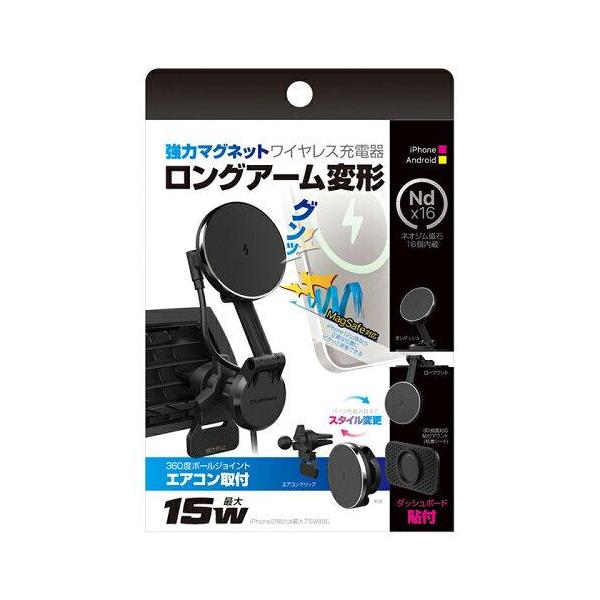 - 【商品説明】●ネオジム磁石を16個内蔵し、MagSafe対応のiPhoneおよびMagSafe対応ケースをご使用のiPhoneを簡単に吸着・ホールド。●MagSafe非対応のスマートフォンにもご使用可能な専用吸着プレートを白・黒で各1枚付属。●MagSafe対応のiPhoneシリーズで最大7.5W、Qi対応のスマートフォンで最大15W充電対応。(急速充電にはQuickCharge2.0以上のUSB電源が必要です。)●エアコンクリップ、3D曲面対応貼付マウント、2種類付属。エアコンフィンに固定、ダッシュボードに貼り付け、2通りの取付けが可能。●2軸可動式ロングアーム採用。エアコン吹出口の風が直接当たりにくい位置へ設置可能。●エアコンクリップは傾きを防止するサポートアーム付き。ボールジョイントで、取り付け後も360°見やすい位置に角度調整が可能。●3D曲面対応貼付マウント(粘着シート)で設置位置の自由度アップ。●通電状況が分かるLED付き。(通電時:赤点灯/充電時:青点灯)●USB電源ケーブル付き。●安全・安心の保護機能付き。短絡保護、過電流保護、過電圧保護、過熱保護、異物検知。※保護ケースを含めたスマートフォンの重さが300g以上ある場合はご使用になれません。※USB電源は付いておりません。定格5V2AまたはQuickCharge2.0以上のUSB電源が必要です。定格以下のUSB電源の場合、充電時間がかかる場合があります。※MagSafe対応ケースに本製品を装着した場合、MagSafeケース側にリング状の跡が残ります。入力5V/9V/12VUSBType-C出力最大15W付属品USB-A-Type-CL字型ケーブル(コード長:約1.2m)/専用吸着プレート(白黒各1枚/プレートサイズ:直径57mm)本体サイズ/重量60W×60H×102Dmm/95g【送料について】北海道、沖縄、離島は送料を頂きます。