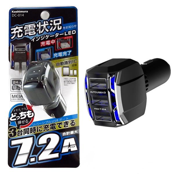 カシムラ DC-7.2A-リバーシブルUSB 3ポート 自動識別IC搭載 DC12V車/24V車対応 シガーソケット 3台同時充電も可能 DC-014