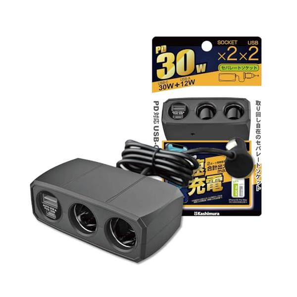 カシムラ 2連セパレートソケット USB PD30W対応 リバーシブルUSBポート 12/24V対応 NKX-247