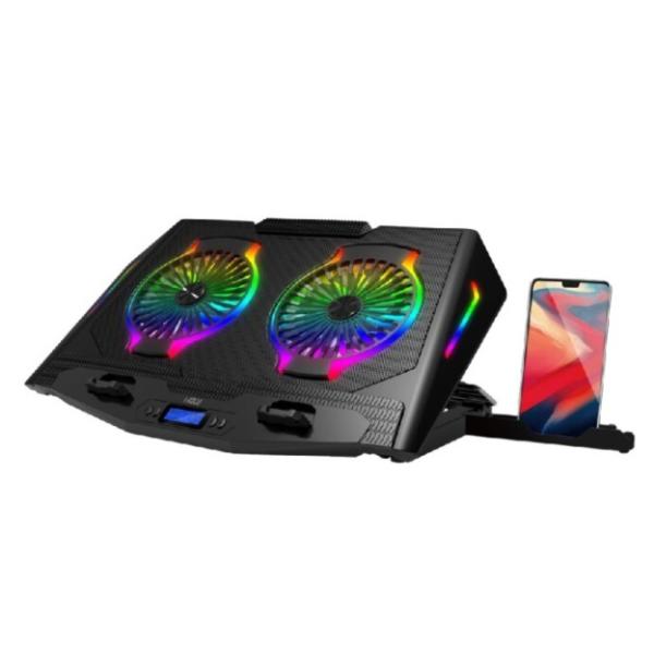 - ■商品特長 ●RGBライトで7種類の点灯効果を実現 ●6段階まで風量調節可能な2ファン仕様 ●17インチのまでのパソコンに対応 ●最大25dbの超静音※ ※23-25dbはおよそ時計の秒針の音や、鉛筆の筆記音に相当します。 ◎角度は5段階に調整可能! ◎スマホスタンドは左右どちらでも設置可能 ●本製品を使用したことによる、直接もしくは間接的に生じた障害、破損について弊社は一切の責任を負いません。 ●高温の場所や火のそばでの使用、放置はしないでください。 ●お買い上げ時の領収書を保証書のかわりとさせていただきますので大切に保管してください。また、領収書や販売店および購入店が記載されている証明書等がない場合や正常な使用状態で不具合が生じた故障以外に関しましては保証対象外とさせていただきます。 ●本製品のデザイン、仕様は改良などにより予告なしに変更する場合がございます。 ●本製品のサイズ、重量はすべて実測ですので、個体により多少の誤差がある場合がございます。