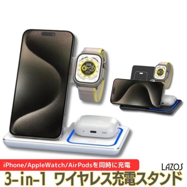 ワイヤレス充電器 iPhone15 iPhone14 iPhone13 ワイヤレス 充電器 折り畳み式 3in1 15w急速 ワイヤレスチャージャー 充電スタンド Qi急速充電 3台 同時充電 横置き 縦置き スタンド充電 AirPodsPro AppleWatch 9 8 7 6 5 SE iPhone12 12Pro おしゃれ 便利
