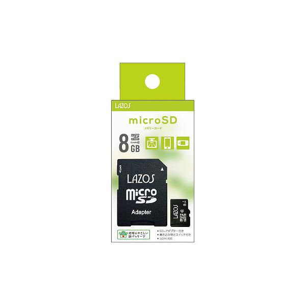 - LAZOSのメモリカード。地球にやさしい紙パッケージ容量:8GB転送速度:CLASS10相当本体サイズ:縦32.0×横24.0×厚さ2.1mm保証期間:1年間SDMI (Secure Digital Music Initiative)対応●必ずお手持ちの機器をご確認のうえ、本メモリカード対応の機種でご使用下さい。●子供の手の届かない所に保管して下さい。また、誤飲にご注意下さい。●本メモリカードのご使用において、製品との相性問題によるデータ破壊、消去が発生した場合、当社は一切責任を負いません。●本メモリカードの使用、使用不能から生じた損害、天災、逸失利益および第三者からの損害、逸失利益および第三者からの請求等に関して当社は一切責任を負いません。●正常な使用での故障の場合は、修理または交換対応となります。記録データなどは保証対象外となります。お客様の責による原因の物理的破損、製品耐久性を超えた故障なども保証対象外となります。