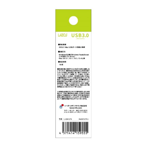 - ■ LAZOS ■【20個セット】Lazos キャップ式USBフラッシュメモリ(ブラック) 4GB◆ 主な特長 ◆◆ 主な仕様 ◆■商品型番L-US4-CPB■JANコード4571414159555■本体カラーブラック■筐体キャップ式■容 量4GB■対応機種DOS/V Mac USBポート搭載の機種■対応OSWindows7以降 (Windows ReadyBoostには対応していません)Mac OS 9.1、10.1、10.2、10.3、10.4以降■インターフェースUSB3.0/2.0/1.1 互換■データ転送速度最大転送速度:15MB/sec簡易商品仕様ブランド名:LAZOSメーカー型番:L-US4-CPB代表カラー:ブラックUSB3.0:有カラー:ブラック記憶容量:4GB最大データ転送速度:15MB/sブランド名(カナ):ラソス