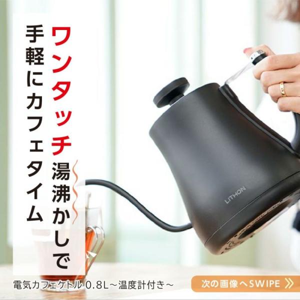 【電気カフェケトル ポット 0.8L】 送料無料 ブラック KDKE-08AB 温度計付 延長保証1年 空焚き防止 ワンタッチで湯沸かし LITHON ライソン